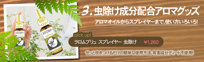 HOME > 虫除け特集~蚊取り器具・虫除け成分配合のナチュラルなアロマ配合グッズ・虫除けアロマオイル・アロマ対応家電~